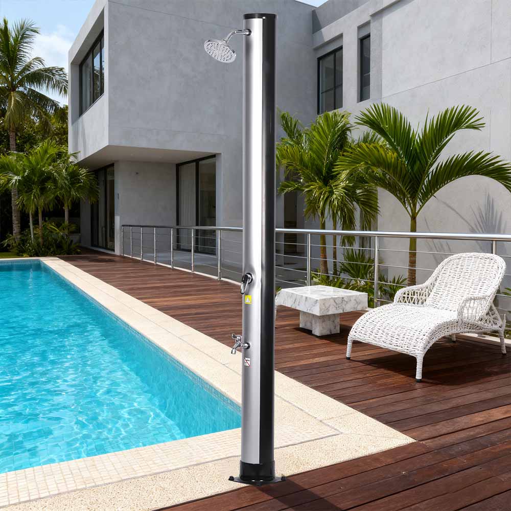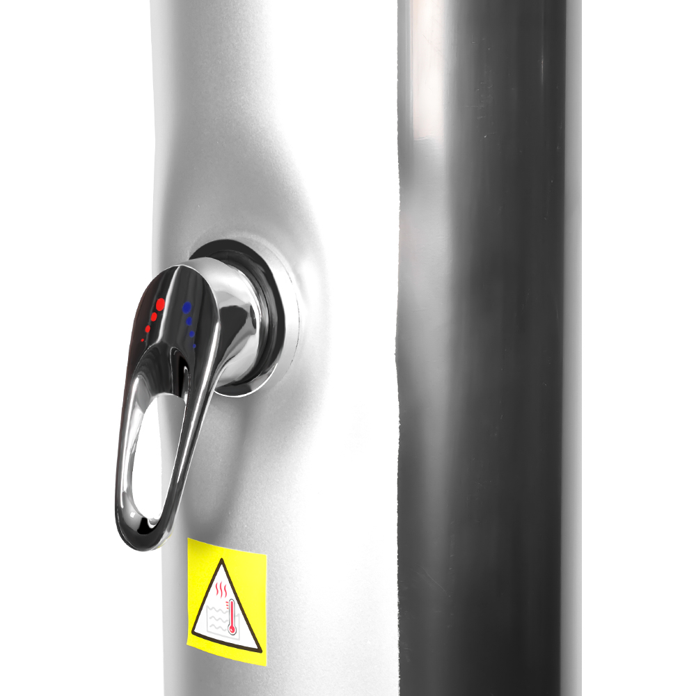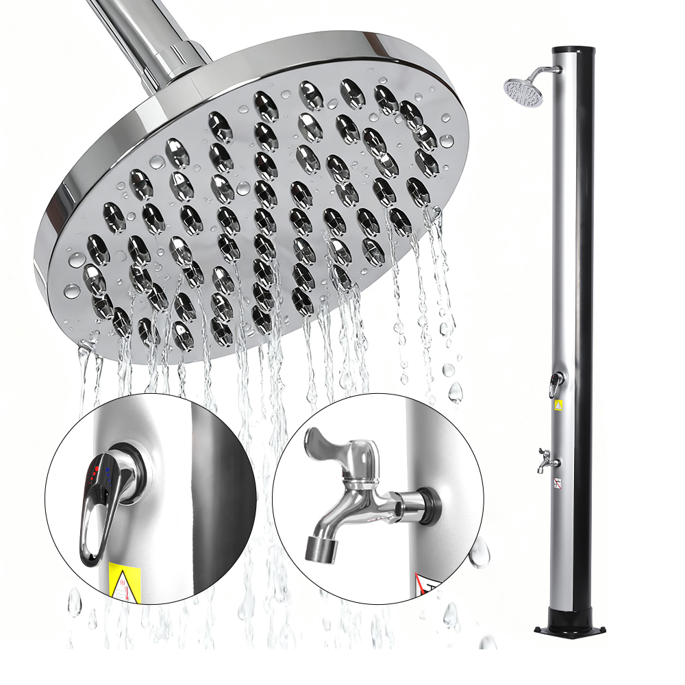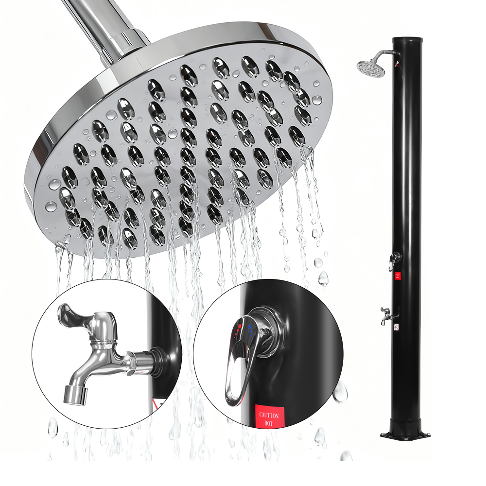Ang napakalaking shower pipe ng LY35L06 portable outdoor eco-friendly solar shower na ito ay gumagamit ng lakas ng araw upang magpainit ng tubig hanggang 60°C, na hindi nangangailangan ng kuryente at nag-aalok ng eco-friendly na solusyon para sa panlabas na paliligo. Ikonekta lamang ang isang karaniwang garden hose upang punan ang shower pipe, at ang buong pamilya ay masisiyahan sa isang nagpapasiglang shower sa hardin, sa tabi ng pool, o sa isang camping trip. Ang isang praktikal na built-in na metal tray ay nagpapanatili sa mga mahahalagang shower tulad ng sabon at shampoo na madaling maabot, habang ang mga drainage slot sa ibaba ay pumipigil sa tubig mula sa pooling, na tinitiyak ang isang malinis at kaaya-ayang karanasan. Ang 360° rotatable rain shower head, na naka-mount sa pinagsamang ball joint, ay nagbibigay-daan sa iyong madaling ayusin ang direksyon ng daloy ng tubig, na lumilikha ng isang kasiya-siyang panlasa sa paglamig, habang ang karagdagang foot rinse tap ay nagbibigay ng isang maginhawang paraan upang mabilis na magpasariwa. Idinisenyo para sa kaginhawahan, ang shower na ito ay madaling i-disassemble para sa compact, space-saving storage sa panahon ng off-season o para sa transportasyon kapag naglalakbay.