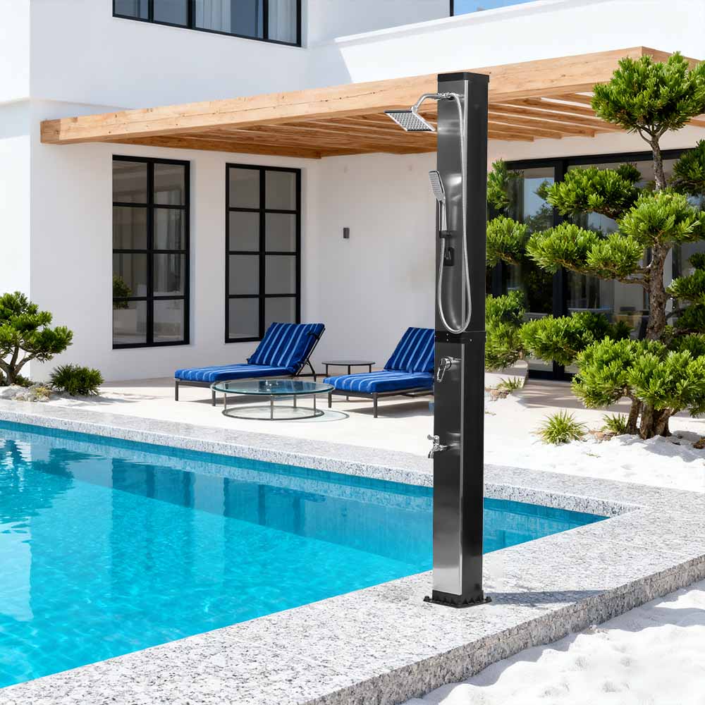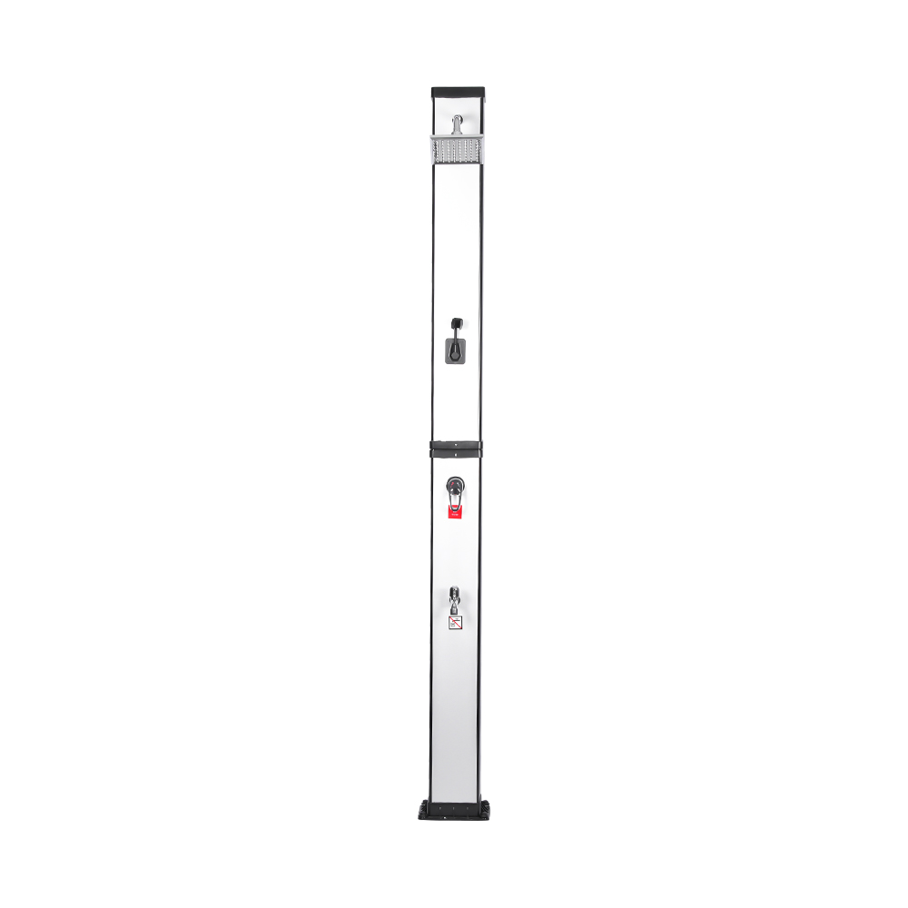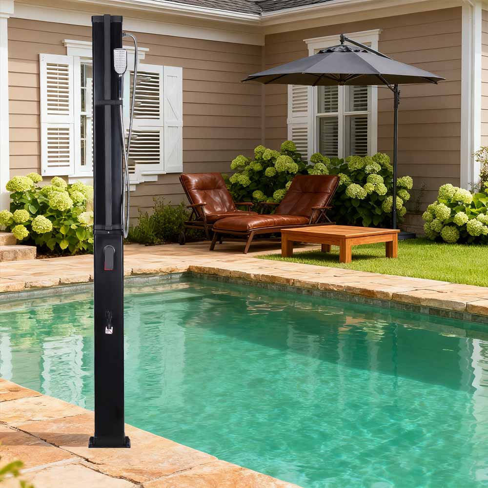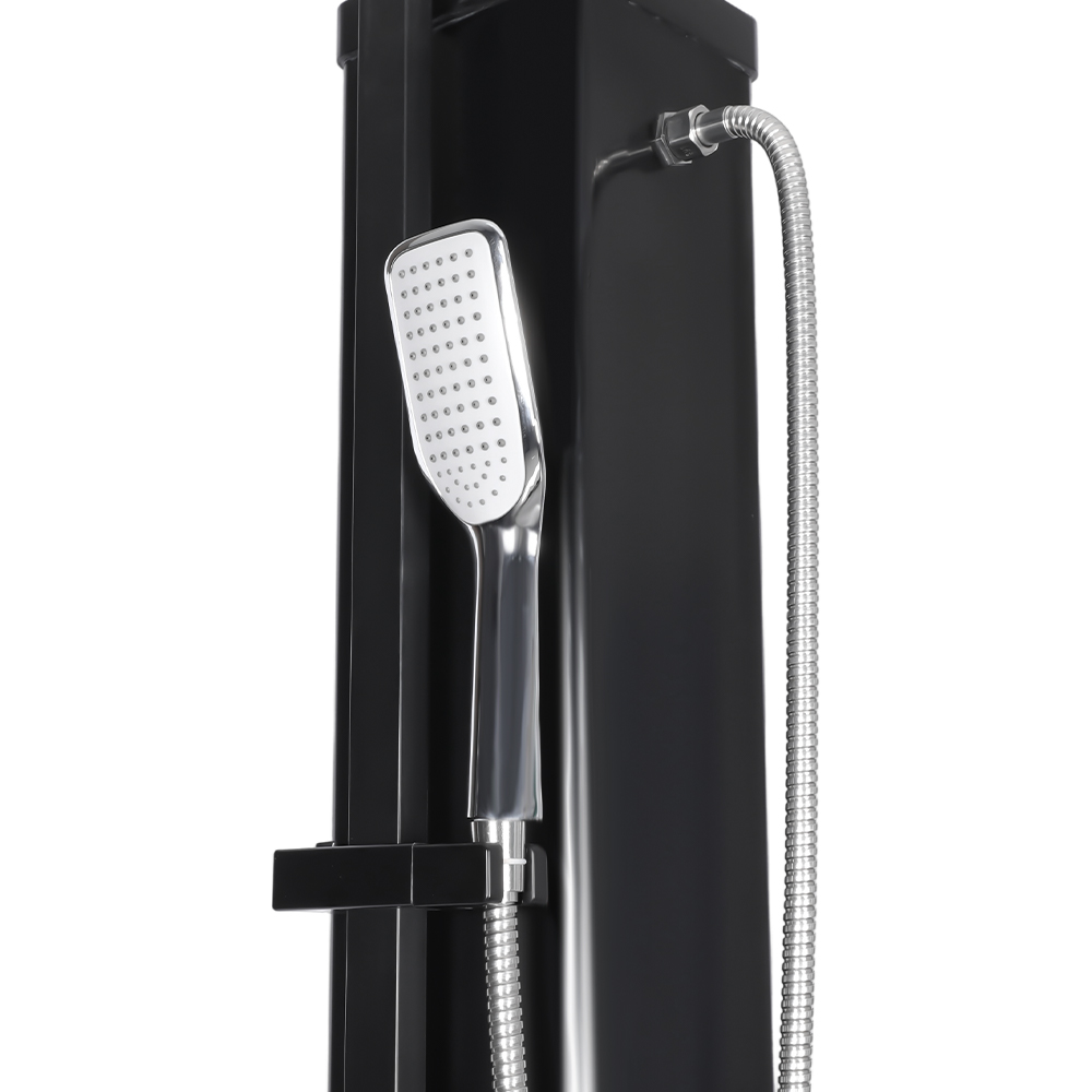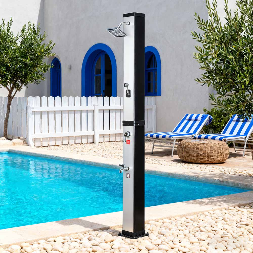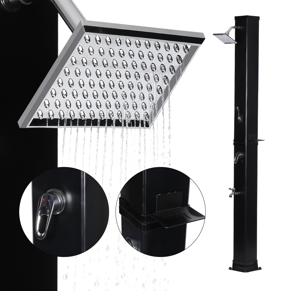 Ang LY35L07 multifunctional large-capacity solar shower na ito ay gumagamit lamang ng sikat ng araw upang magpainit ng tubig hanggang 60°C, na nagbibigay ng isang paraan ng pagtitipid sa enerhiya at kapaligiran upang masiyahan sa panlabas na paliligo. Ang pagpuno nito ay simple—ikonekta lamang ang isang karaniwang hose sa hardin sa pasukan, at ang shower pipe ay mabilis na nakahandang gamitin. Ang isang built-in na metal na istante ay nag-aalok ng isang maginhawang lugar para sa pag-iimbak ng shower gel at iba pang mahahalagang bagay, habang ang mga butas sa paagusan sa base ay tinitiyak na ang tubig ay umaagos nang mahusay, na pinananatiling tuyo at malinis ang lugar. Dinisenyo nang may iniisip na versatility, ang solar shower na ito ay perpekto para sa iba't ibang setting, maging sa beach, sa tabi ng pool, sa isang holiday home, hotel, o bungalow. Ang nababaluktot na istraktura nito ay nagbibigay-daan dito upang umangkop sa iba't ibang kapaligiran.